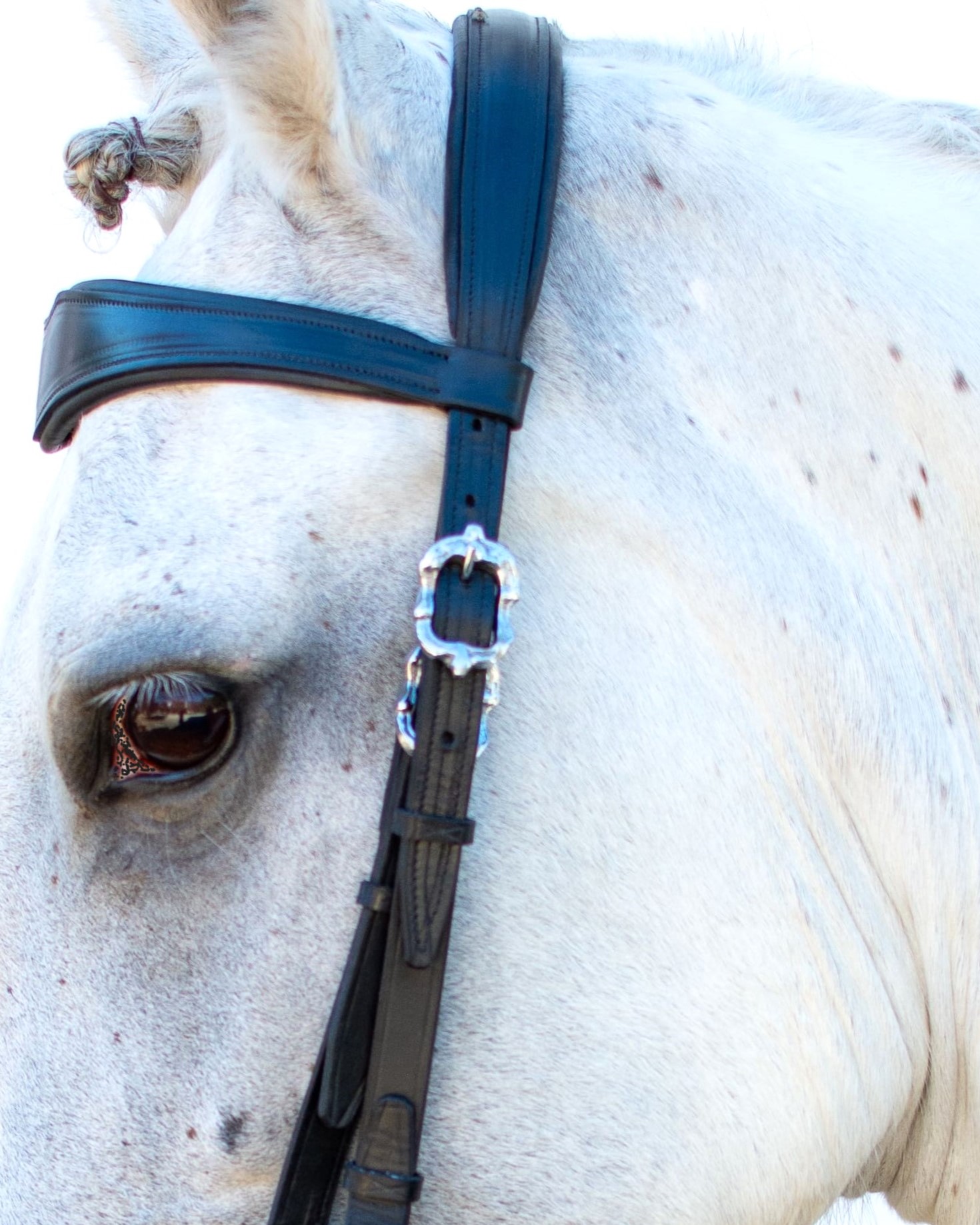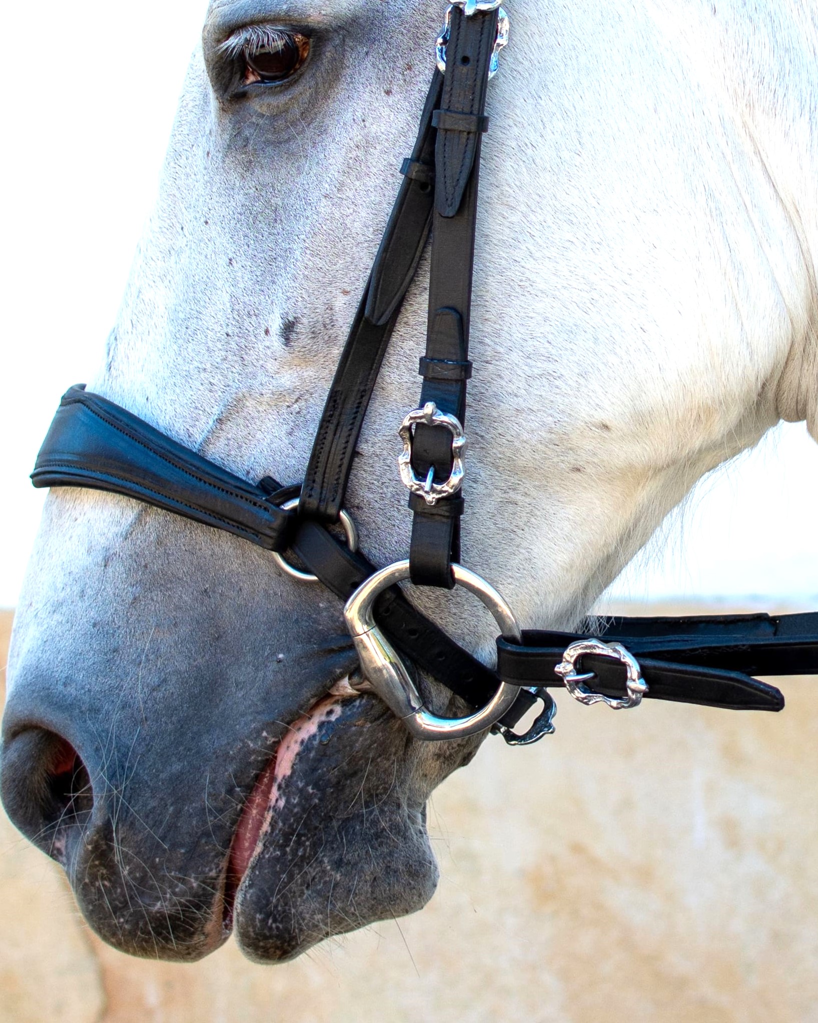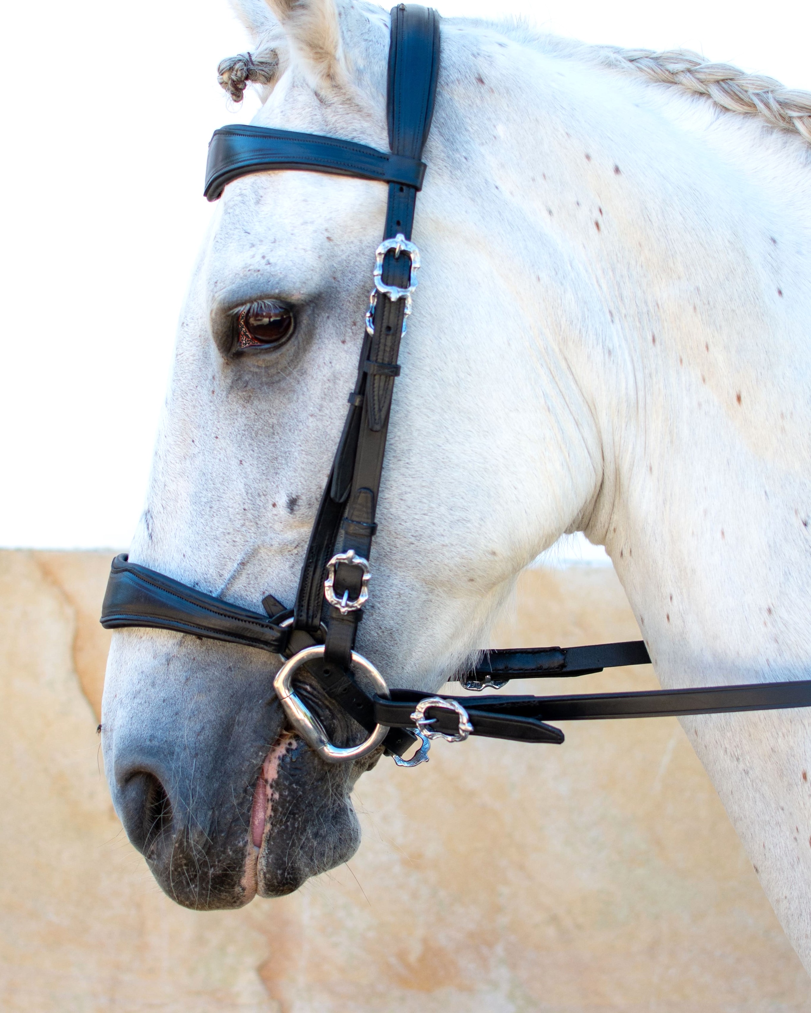 A BREVITAS, da coleção MIX German, é uma criação VMCS onde se privilegiou a qualidade e o conforto. Este modelo distingue-se pela ausência de cisgola e pelo design único na focinheira e testeira, complementado por fivelas barrocas, fazendo dela uma cabeçada mista alemã com um toque da classe e elegância do estilo barroco. Um par de rédeas incluído.